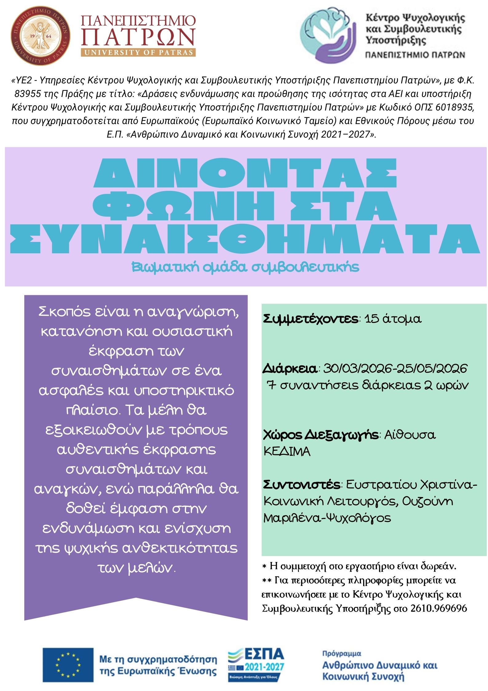Το Κέντρο Ψυχολογικής και Συμβουλευτικής Υποστήριξης του Πανεπιστημίου Πατρών (ΚΕΨΥΣΥΠ) στο πλαίσιο υλοποίησης του ΥΕ2 με τίτλο: «Υπηρεσίες Κέντρου Ψυχολογικής και Συμβουλευτικής Υποστήριξης Πανεπιστημίου Πατρών», Φ.Κ. 83955 της Πράξης με τίτλο: «Δράσεις ενδυνάμωσης και προώθησης της ισότητας στα ΑΕΙ και υποστήριξη Κέντρου Ψυχολογικής και Συμβουλευτικής Υποστήριξης Πανεπιστημίου Πατρών» με Κωδικό ΟΠΣ 6018935, που συγχρηματοδοτείται από Ευρωπαϊκούς (Ευρωπαϊκό Κοινωνικό Ταμείο) και Εθνικούς Πόρους μέσω του Ε.Π. «Ανθρώπινο Δυναμικό και Κοινωνική Συνοχή 2021–2027», με Επιστημονική Υπεύθυνη την Αντιπρύτανι Φοιτητικής Μέριμνας και Πολιτισμού, κα Ελένη Αλμπάνη, Αναπληρώτρια Καθηγήτρια, διοργανώνει πρόγραμμα ομαδικής συμβουλευτικής κατά τη διάρκεια του εαρινού εξαμήνου με τίτλο «Δίνοντας Φωνή στα Συναισθήματα».
